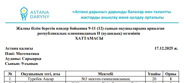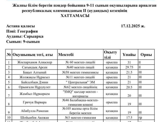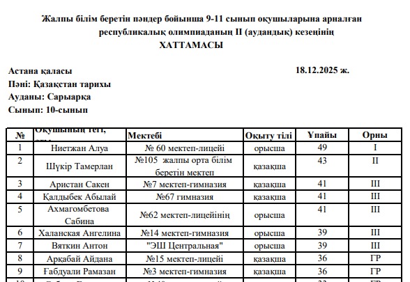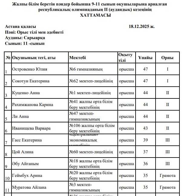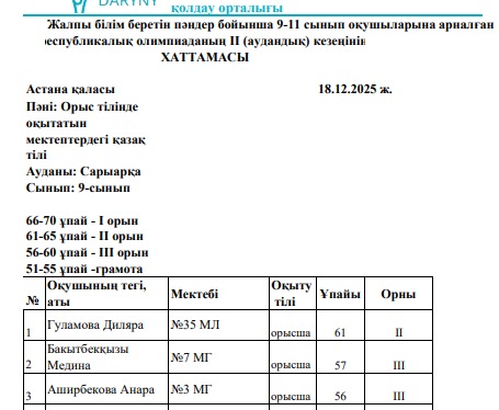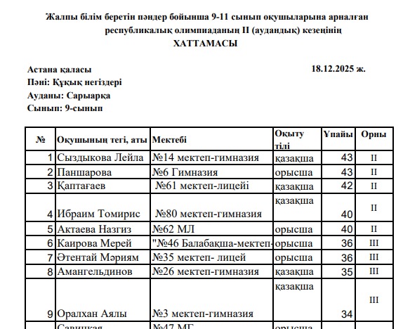 Итоги II (городского) этапа республиканской олимпиады по общеобразовательным предметам среди учащихся 9-11 классов: Бейсембай Айдын (информатика) 3-место, руководитель Рахимжанова С.М., Зайцева Полина (химия) грамота, руководитель Ускембаева Г.К., Токарева Анна (химия) 2-место, руководитель Окружко С.Н., Шойынбек Әкежан (география) грамота, руководитель Джайчиева Д.М., Петько Дмитрий (география) 2-место, руководитель Артамышева И.Т., Шевелёв Владимир (география) 1-место, руководитель Аренов Е.Б., Шпилёв Владислав (физика) 3-место, руководитель Умурзакова А.А., Абдрахман Абдулазиз (биология) грамота, руководитель Муханбедина Э.М., Смирнова Алёна (биология) грамота, руководитель Ускембаева Г.К., Ербасар Төрежан (математика) 3-место, руководитель Сагынбаев А.К., Туребек Аңсар (математика) 1 место, Руководитель Омарова Б.Ж., Валиева Джалила (История Казахстана) грамота, руководитель Салахова Е.В., Ғабдуали Рамазан (История Казахстана) грамота, руководитель Исабекова Г.К., Оралхан Аялы (право) 3-место, руководитель Исабекова Г.К., Қазбек Еркежан (право) 2-место, руководитель Жакыпбекова С.А., Жекен Оразгүл (қазақ тілі) грамота, руководитель Макишева З.М., Аширбекова Анара (казахский язык) 3-место, руководитель Жумабаева З.М., Рахматулина Амина (русский язык) 3-место, руководитель Крючкова Т.В.,Прокофьева Виктория (русский язык) 2-место, руководитель Жетубаева А.А.,Муратова Айлана (русский язык) грамота, руководитель Бегимбаева Б.Т., Капенова Камила (орыс тілі) 2-место, руководитель Жетубаева А.А., Алтай Мерей (ағылшын) 1-место, руководитель Байтасова М.Ш., Австрийская Милана (ағылшын) 3-место, руководитель Джанбаева Г.К.